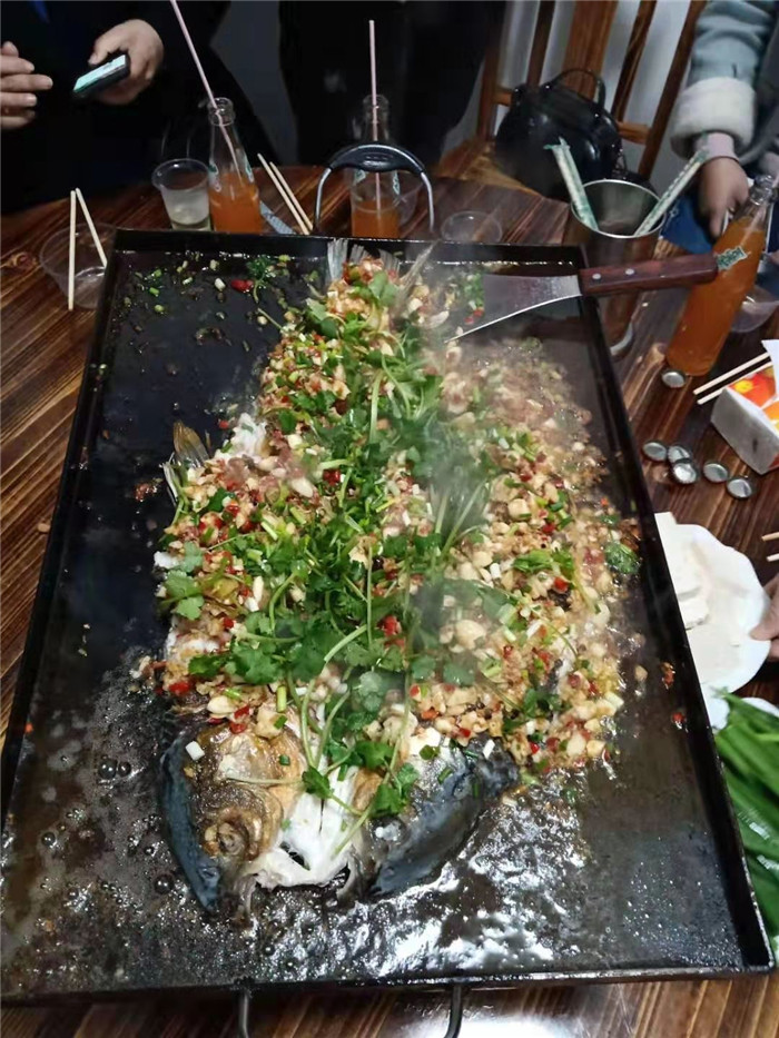 景点游玩结束,格瑞乐环保湖北区域一行驾车来到长阳县县城城区,王总请大家吃了一顿极具清江特色的铁板铲铲鱼,鱼鲜味美,其美味也许主要在其店家精心密制的酱料之中吧,店家服务很周到哦,席间不停为我们添加佐料。